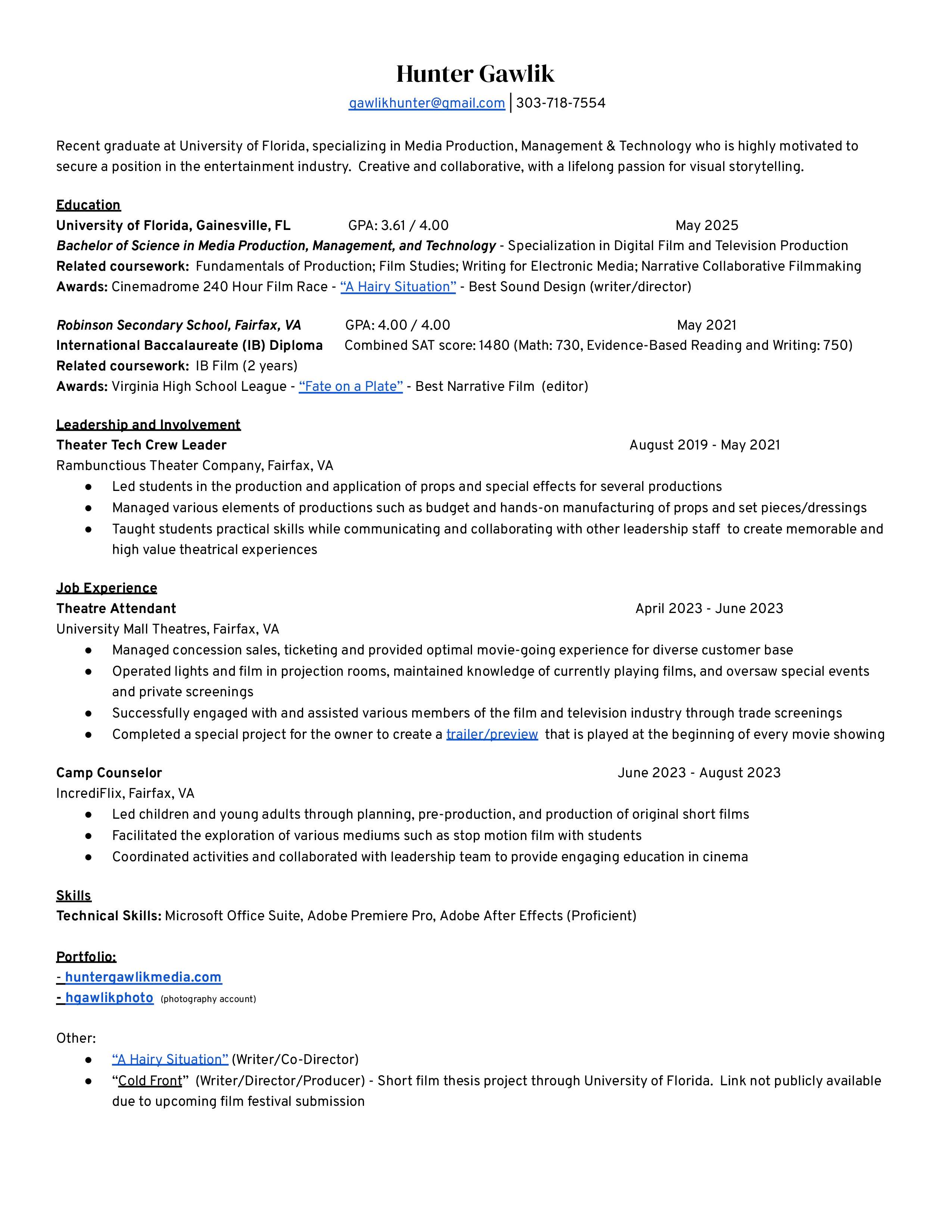 Hello! I’m a filmmaker and photographer from Clifton, Virginia. I graduated from the University of Florida in 2025 with a degree in Media Production, Management, and Technology with a specialization in Film and Television. I’m experieneced in narrative and documentary film, with specializations including writing, directing, editing, and cinematography. I’m excited to bring my voice to new projects and work with other creative individuals and organizations.